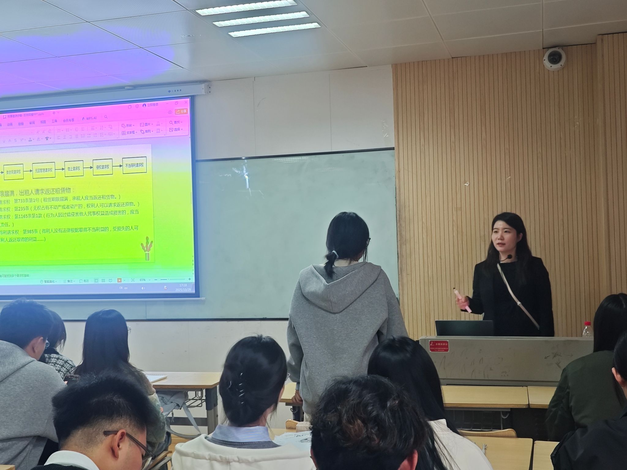 在本次“双师同堂”教学中,每个班级均采用“理论+实务”协同的授课模式:首先由理论教师系统梳理并引导学生回顾《民法典》总则编、物权编与合同编的核心理论与制度框架,为学生奠定扎实的知识基础;随后由律师结合真实案例展开实务教学,三位律师分别以不同的风格和切入点进行讲授,呈现出丰富多样的授课方式,深化学生对理论的理解与应用。