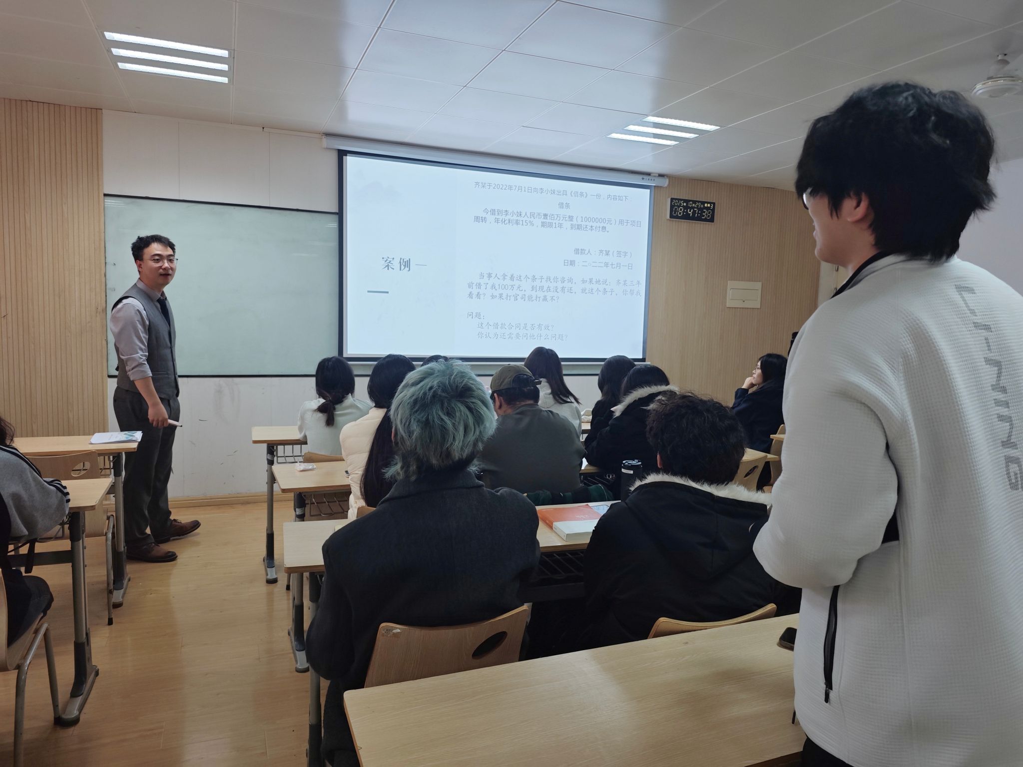 霍逸飞律师以“从校园到法庭的距离”为主题,从“五花八门的条子”这一生动案例引入,拉近法律与学生的距离。通过对比“书本与现实之间的差距”,引导大家重新审视所学知识,并聚焦于“民间借贷纠纷的本金与利息计算”等核心技能进行手把手教学。课堂互动频繁,气氛活跃,有效缩短了从理论认知到实践操作的距离。