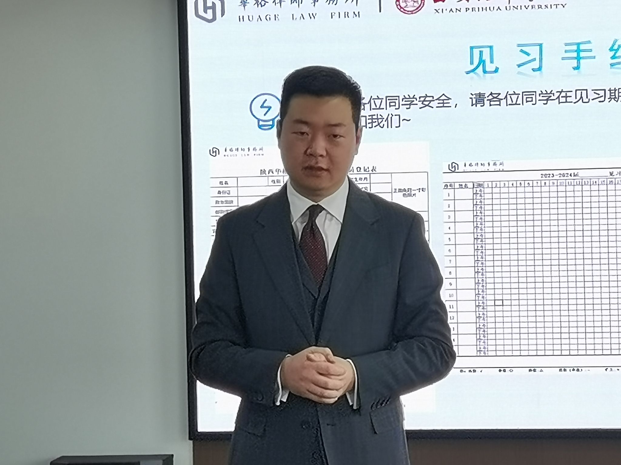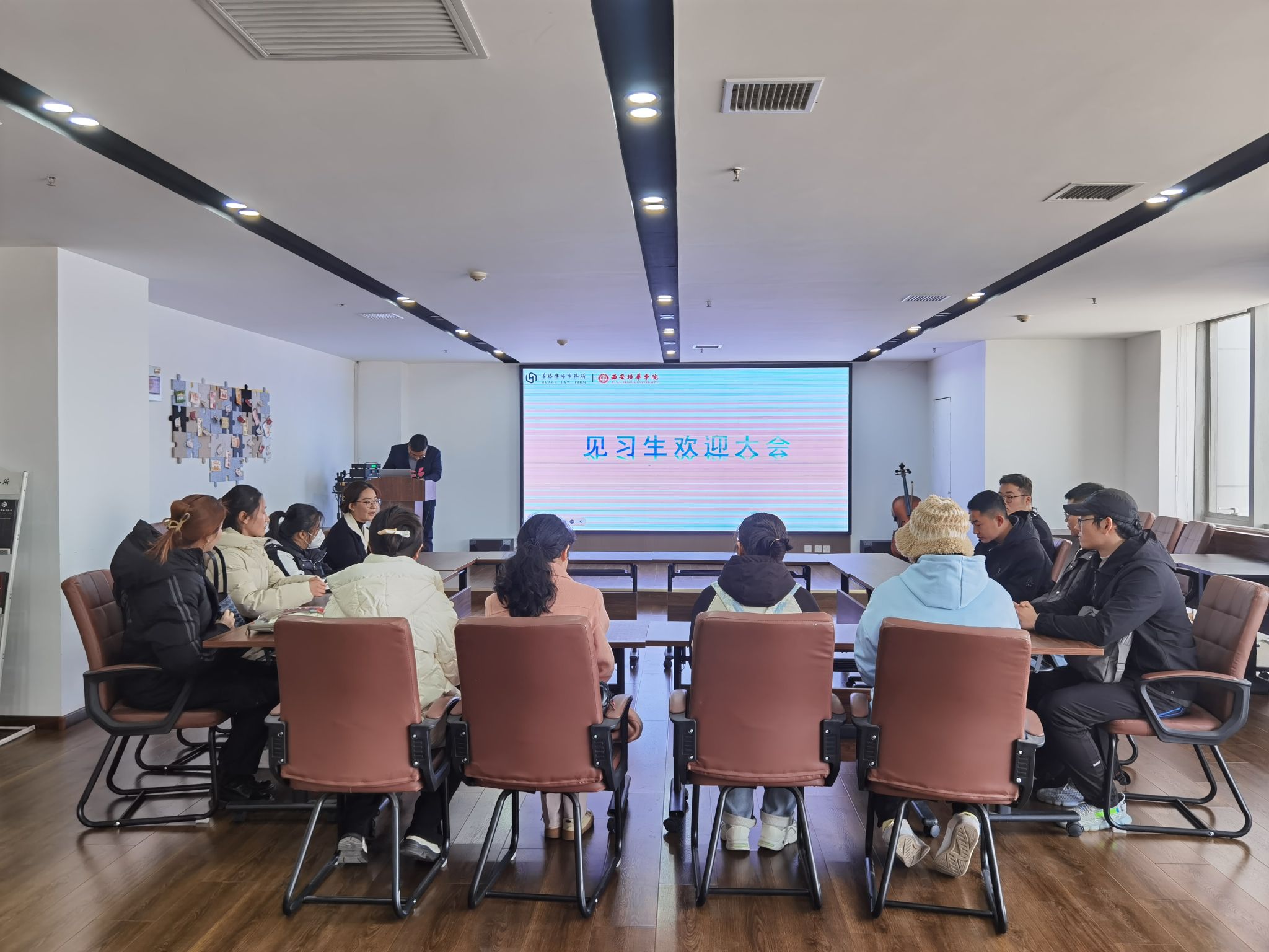李主任在欢迎仪式上提到希望同学们把握机会,珍惜机遇,学会沟通,把理论与实务结合起来。同时,必须树立强烈的保密意识,保守商业秘密、当事人隐私,他鞭策同学们不仅代表个人,更展现的是西安培华学院法学院的精神风貌,时刻以法律人的身份严格要求自己。最后,他重点强调了同学们实习的安全问题,请假需报备,往返途中也一定注意人身安全,希望所有实习生们都能学有所得。
