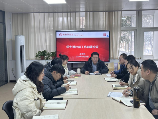 为有序推进法学院2024年春季学期学生开学返校工作,2024年2月22日下午,法学院学生一站式服务站在1116会议室召开本学期第一次工作部署会议。本次会议参会人员有法学院党总支书记兼行政副院长韩斌、团委书记马亮及全体辅导员老师。