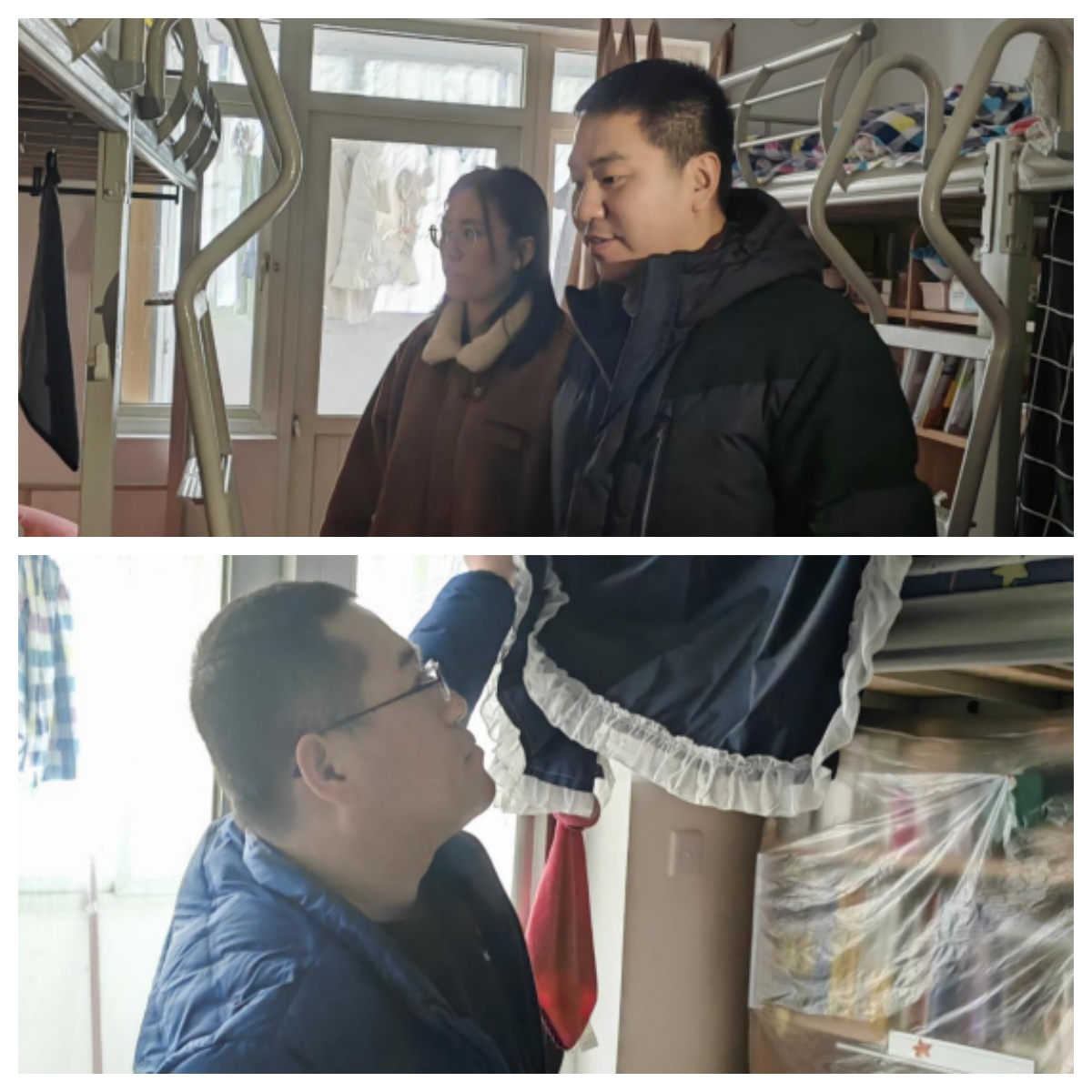 2024年2月25日部分学生返校后我院辅导员及时走访宿舍了解学生假期生活情况,返校后适应情况及需求,并对宿舍学生进行了温馨提示和新春问候。