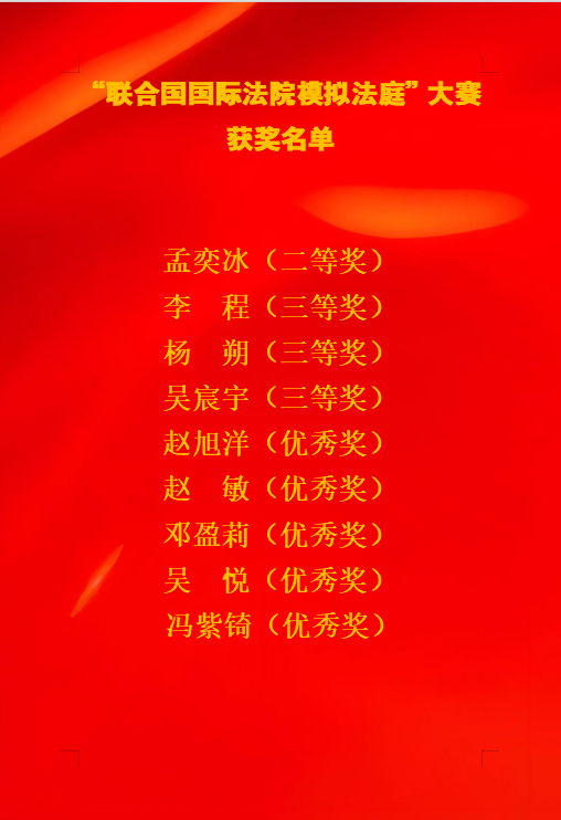 参赛学生包括法学院2024级孟奕冰、2024级赵旭洋、2024级赵敏、2024级邓盈莉、2024级吴悦、2024级李程、2023级杨朔、2023级冯紫锜、2023级吴宸宇九名学生参加个人赛。其中孟奕冰获二等奖,李程获、杨朔、吴宸宇获三等奖。