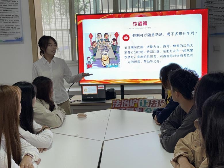 宣讲成员结合国庆假期亲友聚会、同学聚餐的常见场景,通过实际案例分析+互动式问答的方式,沉浸式模拟“强行劝酒”“明知对方饮酒仍让其驾车”等典型情形,解读《民法典》第一千一百六十五条、第一千一百六十八条,明确4种劝酒情形下,共同饮酒人需承担赔偿责任,引导同学们拒绝不良酒桌文化,守住法律与安全底线。