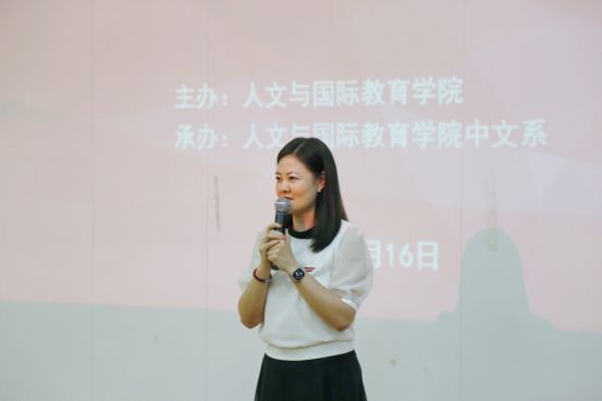 首先,人文与国际教育学院常务副院长梁蕊副教授致辞。梁院长对刘校长的到来表示热烈欢迎,并指出在中文系为接轨用人单位对人才的需求,培养一专多能的应用型复合型人才的背景下,迫切期待像刘校长这样的一线名师,为我们的师生提供方法和指明方向。