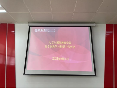 2021年9月13日星期一中午12:00——13:30,人文与国际教育学院法学系在格物楼第四会议室召开了2021-2022学年第一学期第一次教学与科研工作会议,参与本次工作会议的人员有法学系主任马亚乐老师、法学系专业带头人赵旭东教授、法学系副主任高燕老师及法学系全体专职教师。