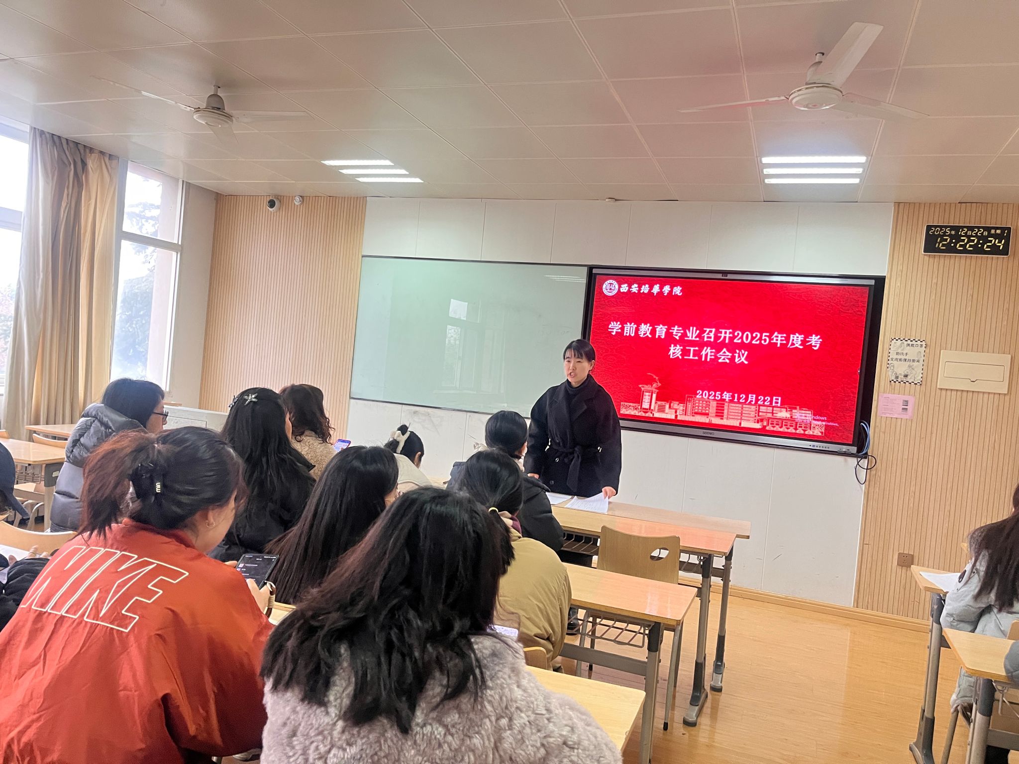 为全面总结2025年度教育教学工作成效,严格落实学校及学院年度考核工作要求,2025年12月22日,西安培华学院国际教育学院教育系召开2025年度考核工作会议。教育系全体教职工参会,系主任王璐露围绕年度重点工作进行述职汇报。
