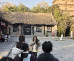 本次实践将教学现场置于文化景区之内,要求学生分组在西安博物院及小雁塔进行实时、实景的模拟讲解。活动中,企业导师薛晓梅首先结合博物院重点文物与展厅布局,现场演示了专业导游的讲解流程与跨文化解说技巧。随后,学生以小组为单位,自主选择展馆或景点,现场开展模拟讲解,真正实现“在实景中练、在情境中说”。三位老师跟组进行现场指导。