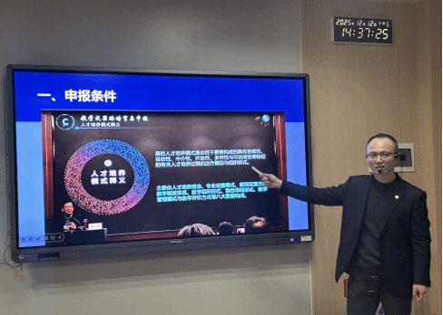 2025年12月12日下午14:30,国际教育学院在格物楼1201教室成功举办了一场题为“教学成果奖凝练与申报”的专题教研活动。本次活动由学院教师金培玉主讲,吸引了来自各系部的20余名教师积极参与,共同探讨教学成果的总结、提炼与申报策略。