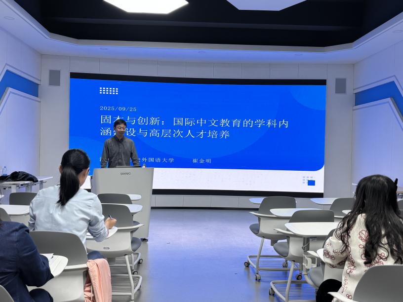 为深化国际中文教育的学科内涵建设,提升高层次人才培养质量,2025年9月26日14:30,我院在应用型文科虚拟仿真(VR)实训中心举办专题讲座,特邀西安外国语大学崔金明教授作《固本与创新:国际中文教育的学科内涵建设与高层次人才培养》主题报告。讲座由栾博强院长主持,汉语国际教育专业全体教师参加。