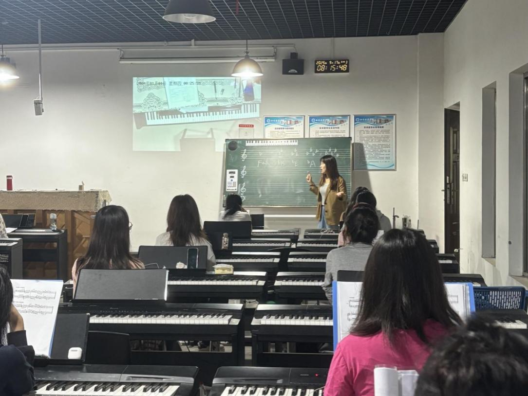 在回课练习指导环节,黄老师重点拆解穿跨指技巧,通过“分组展示”“逐人纠错”的方式,确保每位学生都能扎实掌握技巧;同时结合儿歌伴奏需求,点明琶音练习的实用价值,让教学更贴合幼儿教育实际。练习曲《小溪》教学中,她从乐句划分、节奏把控到双手合练力度技巧逐步拆解,更针对性引导学生思考“如何用‘认音游戏’‘拍手练节奏’等幼儿适配方式开展教学”,助力学生实现“学演奏”与“懂教学”的双重目标。课程尾声,黄老师布置练习视频打卡、唱谱等作业,强化巩固效果,让同学们在课堂中兼顾专业性与实用性,为未来幼儿音乐教学积累扎实经验。