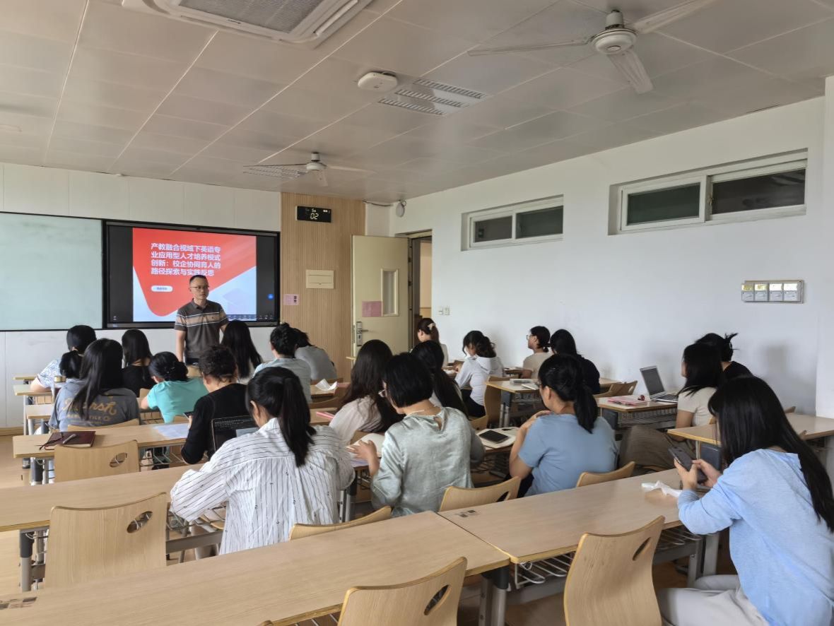 5月26日下午,英语专业教研室召开“产教融合视域下英语专业应用型人才培养模式创新”专题教研会。会议聚焦国家产教融合战略背景,以校企协同育人路径探索为核心,结合跨境电商、国际教育等行业发展需求,系统总结英语专业近年来在应用型人才培养中的实践经验与反思。本次会议由外语系副主任金培玉主持,英语专业教研室全体教师参会,刘云航副教授作主题报告。