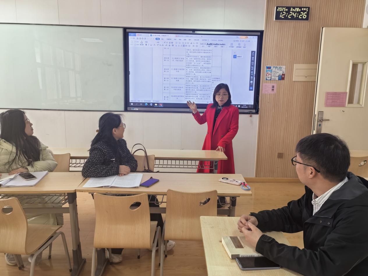 活动伊始,课程组组长罗妮老师对本学期教学工作进行了全面分析。她强调,《中国古代文学(三)》涵盖元明清文学,作品丰富、文化多元,在有限的课时内既要保证知识的系统性传授,又要突出重点、难点,引导学生深入理解作品内涵。其次,罗老师指出如何将古代文学教学与当下时代需求相结合,激发学生的学习兴趣,也是亟待解决的问题。罗老师提出,后续教学要合理整合教学内容,巧妙运用多样化教学手段,增强课堂互动性。同时,也要将课程思政融入教学,挖掘作品中的家国情怀、人文精神等元素,培养学生的文化自信与价值观。
