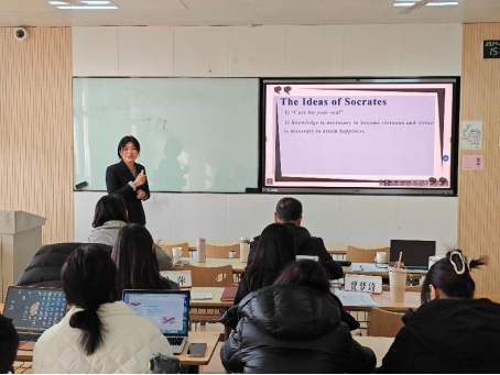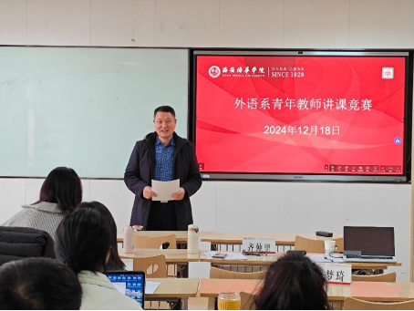 为助力青年教师自身成长,加强青年教师队伍建设,充分发挥教学技能比赛在提高教师队伍素质中的示范引领作用,鼓励教师积极钻研教学业务,创新教学方法和教学手段,推进现代教育技术与传统课堂的深度融合,进一步提升教学能力,提高教育教学质量,人文与国际教育学院外语系12月18日举办了第十四届青年教师教学竞赛。本次竞赛邀请了第12届“外教社杯”全国高校外语教学大赛陕西赛区英语专业组一等奖获得者、西安理工大学外国语学院李琳桢老师担任校外评委,外语系英语专业带头人、校级督导齐仲里教授,外语系副主任金培玉老师、大学英语课程负责人贾梦琦副教授、外语系周萍老师担任校内评委,外语系部分教师观摩了比赛。