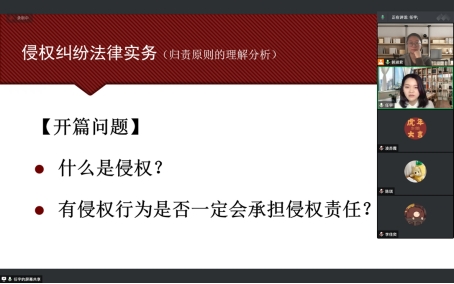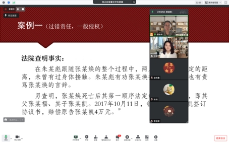 授课时,律师通过对四个典型鲜明侵权案例的引用,向同学们展示了真实案例的复杂性;通过对民事裁判文书真实内容的展示,让同学们了解民事判决书的一般书写框架和内容;通过对案件事实的解剖分析,使同学们初步明确侵权责任的归责原则,并对归责原则的含义、运用有了一定的理解。