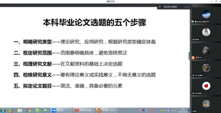 其次,论文工作组负责人杨琳老师向同学们详细介绍了毕业论文的重要时间节点,毕业论文指导老师的相关信息以及毕业论文撰写的方法,包括资料的检索、选题的确定、大纲的撰写及论文字数和格式要求等。希望同学们按照要求撰写论文,严格遵守论文的格式和标准,为论文答辩及中期检查和评阅认真做好准备。