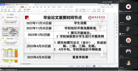 为了有效落实西安培华学院人文与国际教育学院法学系2023届毕业班学生的毕业论文工作,确保论文选题等相关事宜如期实施。法学系于2022年10月26日下午两点十分,通过腾讯会议举办了毕业论文动员大会,法学系全体论文指导老师及毕业班同学参加了此次大会,大会由法学系裴文杰老师主持。