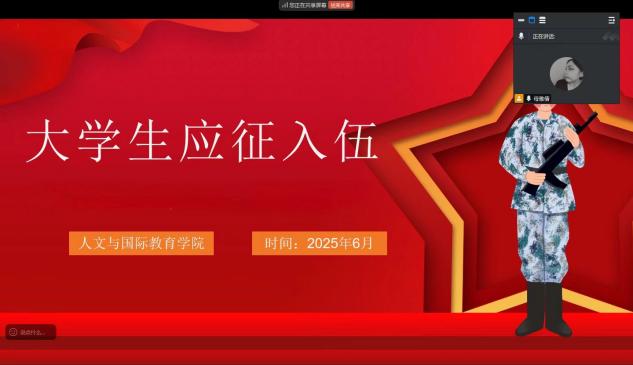 “国无防不立,民无兵不安”当大学的生活即将画上句号,大四学子正站在人生的十字路口,在考研深造、职场打拼的选项之外,投身军旅、报效祖国也成为了一条充满荣耀与挑战的璀璨之路。为助力大四毕业生深入了解征兵入伍政策,激发他们的爱国热情与参军报国之志,人文与国际教育学院组织毕业班辅导员为大四毕业生召开了线上征兵入伍政策宣讲会。