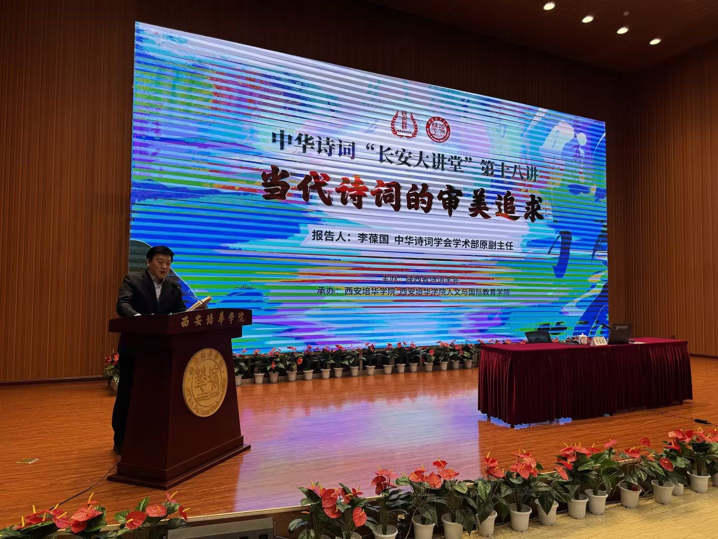 2025年3月15日,由陕西省诗词学会主办,西安培华学院、西安培华学院人文与国际教育学院承办的中华诗词“长安大讲堂”第十八讲,在我校维之图书馆报告厅成功举办。本次讲座的主题为“当代诗词的审美追求”,由中华诗词学会学术部原副主任李葆国先生担任主讲嘉宾。来自全国各界的诗词爱好者、西安培华学院人文与国际教育学院中文系全体教师以及人文与国际教育学院部分学生,共计400余人参加了此次讲座。