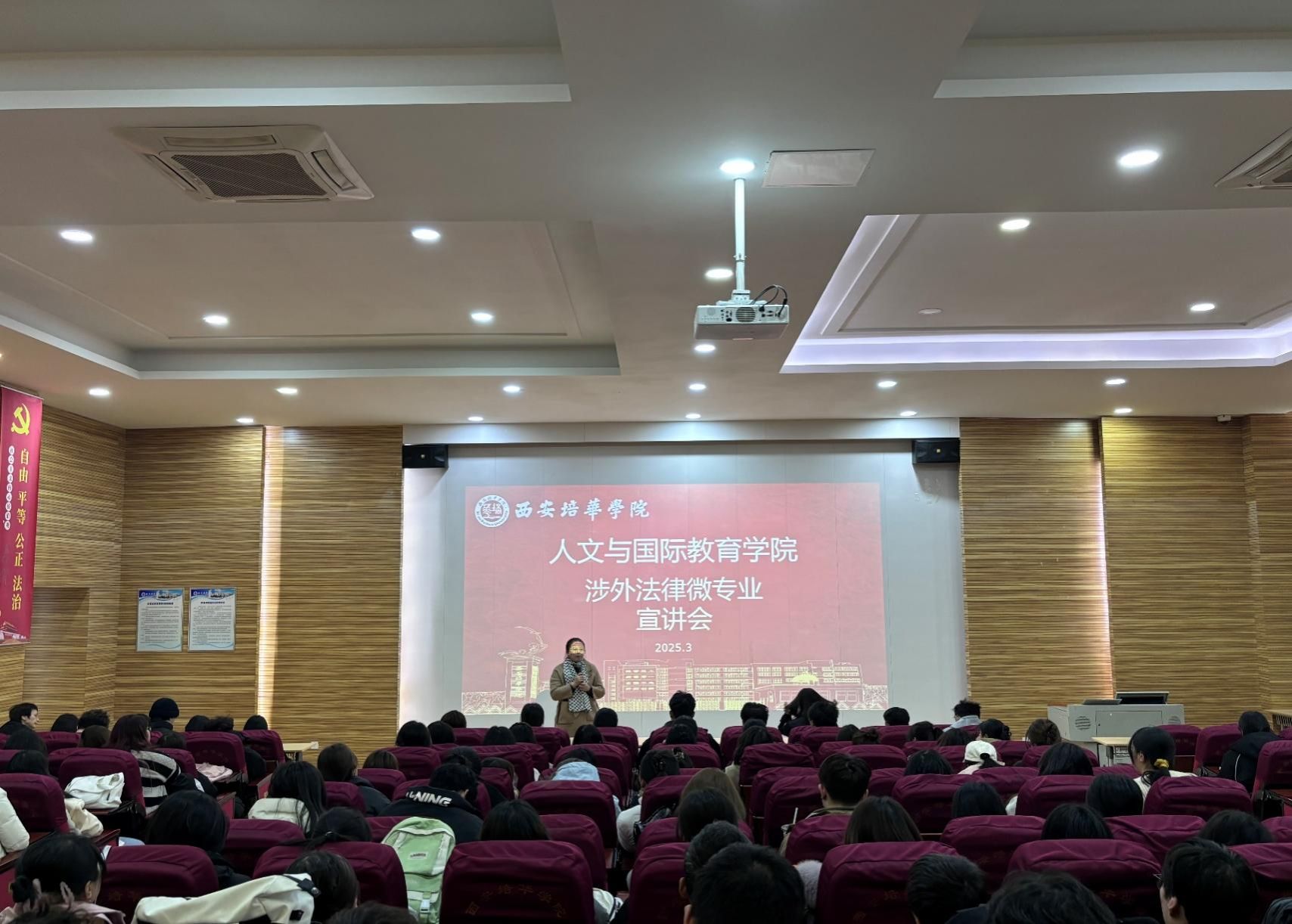 人文与国际教育学院梁蕊院长从外语专业学生职业规划方面给学生提出了建议。梁院长向学生分析了国内高校涉外法律人才培养的缺口,以及我校作为陕西民办高校中唯一拥有法学专业的优势,号召学生抓住我们的优势,用好各类资源,为自己的未来拓展一个新的发展方向。