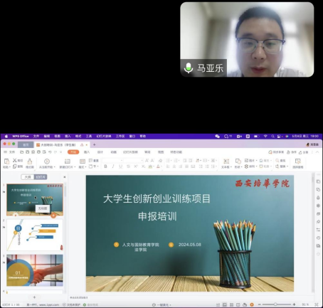 为进一步做好大学生创新创业训练项目申报培训,2024年5月8日晚19:00-20:00,人文与国际教育学院联合法学院共同举办了“2024年大学生创新创业训练项目申报培训”线上培训会。本次活动诚邀西安培华学院法学院法律实务教研室马亚乐主任主讲,学院选拔参赛学生70余人及部分指导教师参加了培训会。