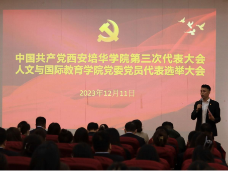 中国共产党西安培华学院第三次代表大会人文与国际教育学院党委党员代表选举大会于2023年12月11日12:30在格物楼J101举行。本次大会选举产生人文与国际教育学院出席我校第三次党代会的34名师生党员代表。本次大会由学院党委书记南兵主持,学院全体教工党员及部分学生党员代表参加。