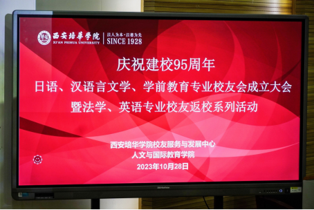 为团结和凝聚广大校友、共庆培华建校95周年,10月28日上午9点30分,我院在格物楼J101举办喜迎建校95周年为主题的日语、汉语言文学、学前教育专业校友会成立大会暨法学、英语专业校友返校系列活动。西安培华学院理事长姜波,校学术委员会主席、副校长、学院院长刘越莲,校党委副书记、监事会主席、纪委书记、工会主席徐国富,校友服务与发展中心主任柳雨,校友服务与发展中心干事王慰,我院常务副院长梁蕊,党委书记兼副院长南兵,教学副院长赵洁,党委副书记韩斌,各系主任、副主任,教师代表、辅导员代表和各系各专业校友代表参加本次活动。