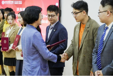 西安培华学院监事会主席、党委副书记、纪委书记、工会主席徐国富宣读《关于日语、汉语言文学、学前教育专业校友会的批复》并为新聘任的日语专业、学前教育专业、汉语言文学专业校友会理事授牌并颁发聘书