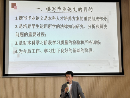 然后由法学系论文组负责人江欣燕老师向同学们详细介绍了法学系2024届毕业论文的重要时间节点和毕业论文指导老师的相关信息,提醒同学们按时完成论文相关工作。