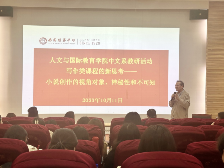 为提升教师教科研能力,促进教师专业能力发展,人文与国际教育学院中文系于2023年10月11日(周三)16点10分在格物楼J101会议室开展专题讲座教研活动,主题为“写作类课程的新思考——小说创作的视角对象、神秘性和不可知”,由仵埂教授主讲,中文系庞欢副主任主持,中文系全体教师参加此次活动。