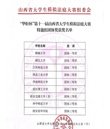 9月10日,山西省大学生模拟法庭大赛组委会公布了第十一届“华炬杯”山西省大学生模拟法庭大赛特邀组团体奖的获奖名单。西安培华学院荣获团体三等奖。