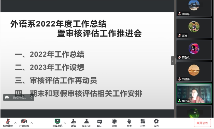 会议围绕2022年工作经验总结、2023年工作设想、审核评估工作再动员、期末和寒假审核评估相关工作安排等四个方面逐项进行。