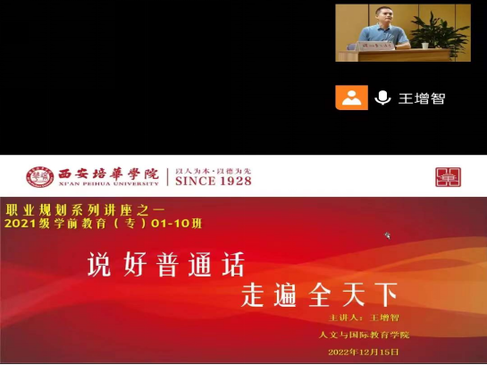 人文与国际教育学院学前教育专业王增智副教授,针对即将毕业的2021级学前教育专科学生,开展了题为“学好普通话,走遍全天下”“音准和音美”两场职业规划系列讲座。讲座中,王老师详细阐述了“说好普通话,写好规范字”在未来择业就业中的重要性,还从祖国统一、国家安全的角度,给同学们以新的视角,重新认识普通话的重要性,提升了同学们的爱国热情。说到朗诵、朗读的技能时,王老师结合幼儿教师的故事讲述技能,声情并茂地给同学们做了示范、举了例子,现场气氛活跃,得到了同学们的一致好评。