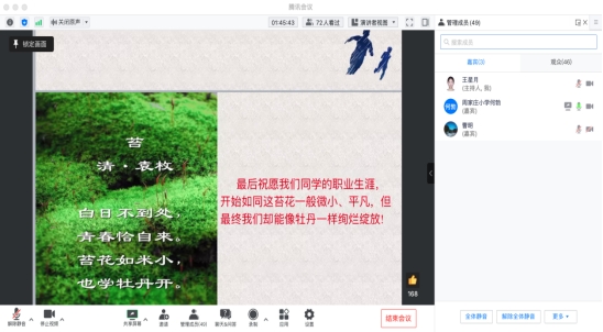 最后,何校长将一首贴切的诗歌赠与同学们,“白日不到处,青春恰自来。苔花如米小,也学牡丹开”。希望同学们未来的教师职业生涯也能如同苔花一般虽平凡渺小却意义非凡。相信聆听了何校长精彩生动的讲解后,同学们能对个人职业的发展规划有着更清晰、更深刻的认识,并以一名优秀教师的标准严格要求自我,不断奋进!