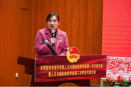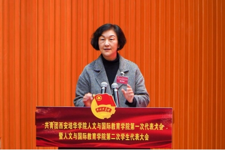 西安培华学院学术委员会主席、副校长、人文与国际教育学院院长刘越莲教授为本次大会致开幕词。她强调本次双代会是我院青年团员政治生活中的一件大事、喜事、盛事,也是对我院青年团员政治工作的认可,本次大会是我们人教学院团务工作承前启后、继往开来的新起点。各位同学要把学习作为一种责任、一种精神追求、一种生活方式,求真学问,练真本领,在勤学敏思中不断增长才干,在社会实践中不断磨砺自我,在肩负时代重任中行胜于言,在真刀真枪的实干中成就一番事业。