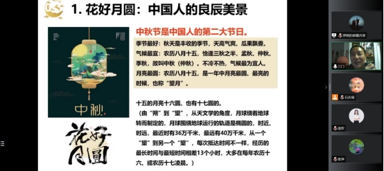 最后,闫建滨教授对中秋节习俗的形成及其文化内涵进行讲解,如月饼习俗的形成有唐、宋、元、明等不同说法。自唐宋以来,八月十五是一年中的最佳赏月时成为传统,并与大家分享了各地不同的特色习俗。