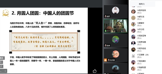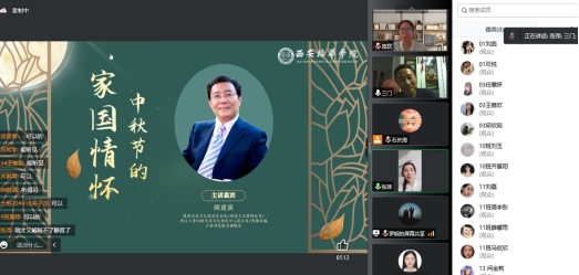 2022年9月9日下午14:00点到16:00点,人文与国际教育学院中文系举办“中秋节的家国情怀”的线上讲座,特邀陕西节庆文化促进会会长、西安文史馆研究员、西北大学中国节庆文化研究中心副主任闫建滨教授为主讲嘉宾,讲座由中文系副主任罗妮老师主持,中文系全体教师及20级、21级学生代表参加本次讲座。