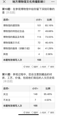 同学们在实地调研的同时,还发布了地方博物馆的文化传播影响力的网络调查问卷,共收到了155份问卷。问卷内容围绕调研实践的五个方面的主题展开,详细了解了参观者们对博物馆的宣传途径、文化影响力、文创产品购买等方面的观点,为本次暑期社会实践提供了更为详实的数据支撑材料。