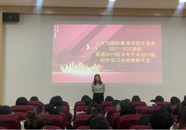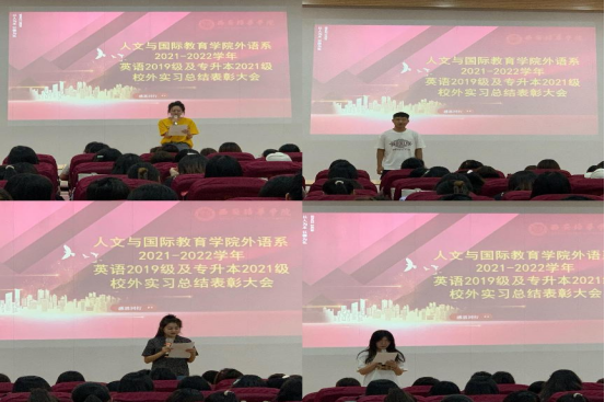 2022年7月1日中午12:30,外语系英语专业2019级及专升本2021级校外实习总结表彰大会在2号教学楼J202召开。外语系副主任周萍老师、英语教育方向和商务英语方向各班实践带队教师出席,英语专业2019级、2021级专升本共计270余名学生参加会议。会议由教育方向实践负责人曹明老师主持。