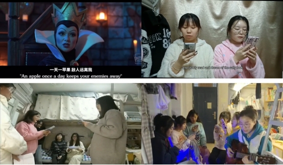 英语专业2021级的学生们在西安封控期间不忘初心,坚持英语学习,刻苦练习英语基本功。本年级各班的学业导师们在众多作品中进行筛选,最终以班级为单位选出了八个参展作品,包括影视配音、诗歌朗诵、话剧表演、歌曲弹唱等特色节目。这种融动作表演、音乐、语言为一体的英语节目表演,给在场的师生带来了一场精彩的视听盛宴。