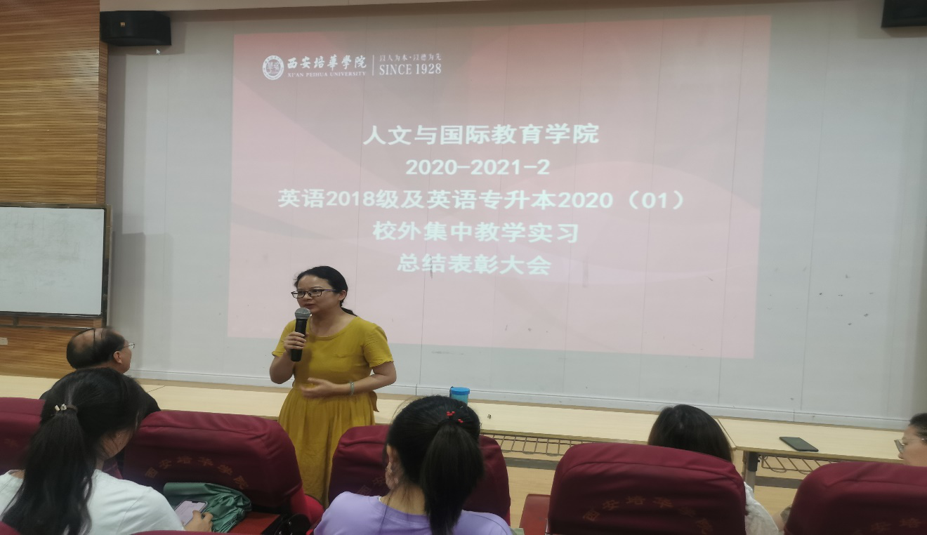 紧接着由院长助理付丽伟副教授进行了发言,提出见到我院英语专业教育方向的实习工作如此的丰富及效果良好,感到为我们同学感到由衷的高兴,并提出了对学生们未来就业顺利的殷切希望。