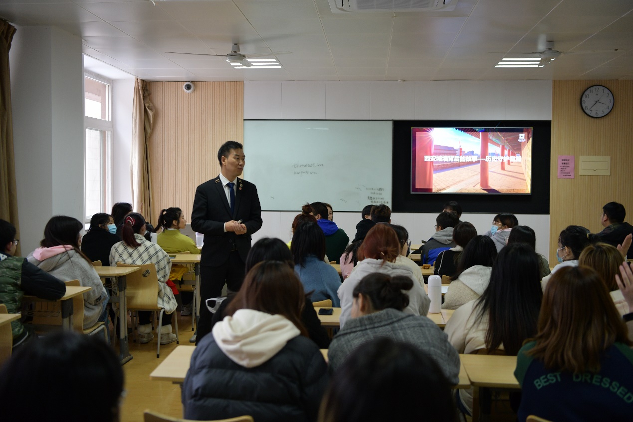 紧接着由西安曲江城墙旅游发展有限公司的王彦炜副总经理和同学们分享了关于西安城墙的涉外接待及商务来访中接待礼仪等问题。通过视频播放科普以及妙趣横生的解说使同学们对城墙旅游发展有了更深刻的体会,对城墙的旅游接待工作有了更深刻的了解。宣讲会上,王彦炜副总经理详细向同学们介绍了日常准备工作,服务事例,日常管理,工作标准,城墙各类文化活动以及传递出尊重,热爱,复兴的景区服务核心价值观。为同学们的面试以及未来职业规划都做出了悉心指导,学生表示受益匪浅。