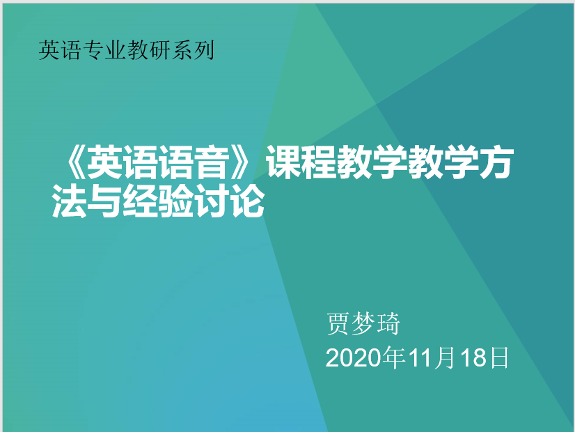 随后,由英语专业《英语语音》课程教学经验丰富的贾梦琦老师跟大家做了本门课程教学方法和经验的分享。贾老师先介绍了本届新生英语水平的情况,属于普遍基础较好、口音较轻、学生自主学习能力较强的类型,因此,应该在往年语音教学基础上进行高阶语音教学材料的训练。同时,贾老师给出了很多形象丰富的教学范例,给了大家尤其是语音课程老师丰富的教学思路。