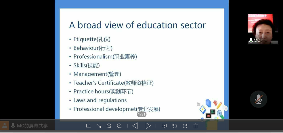职业生涯规划是当今高校的重要话题,职业生涯活动将伴随学生的大半生,拥有成功的职业生涯才能实现完美人生。但是,事实上,很多大学生在毕业时候也还没有真正理解职业生涯规划的确切含义,对职业生涯规划的意义的认识也存在严重不足,不了解职业生涯规划的程序,缺乏进行规划的具体技巧等,这些都会导致职业生涯规划的应有作用不能充分发挥。为此,人文与国际教育学院英语专业在外语系主任甘世安教授的组织与安排下,进行深入研讨,最终确定学生感兴趣并且以自己的职业选择的教育与商贸两个话题,在腾讯会议进行,英语专业18级全体学生参于职场深度讨厌与分享。