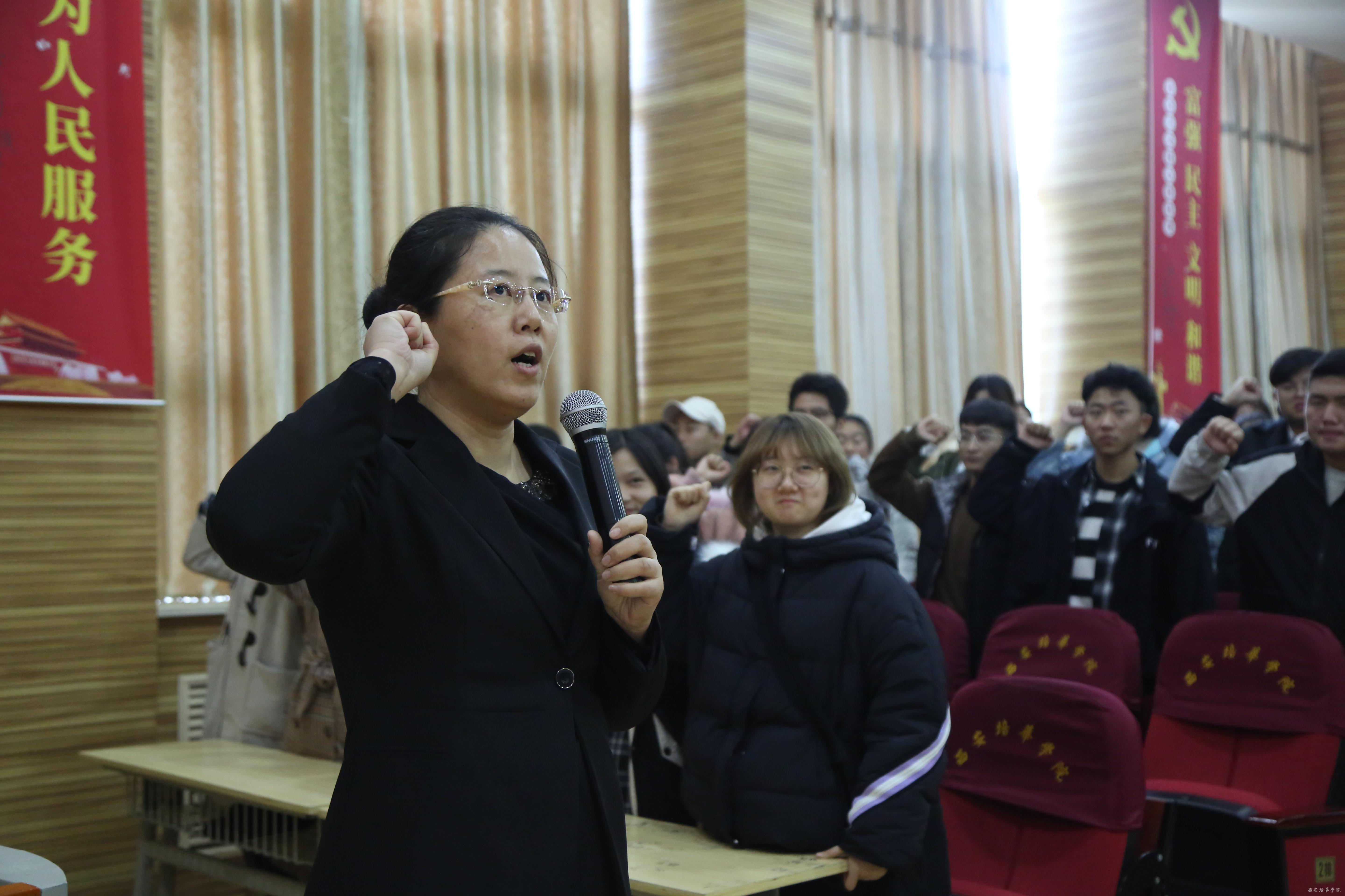 誓词在赵洁老师带领下进行。“我宣誓:我是中国人,我决心忠于宪法和法律,维护宪法权威,认真学习法律知识,增强法律观念,依法行使权利,忠实履行义务,坚守社会正义,维护法律尊严,用我所学服务社会,做一名合格的法律人。“”