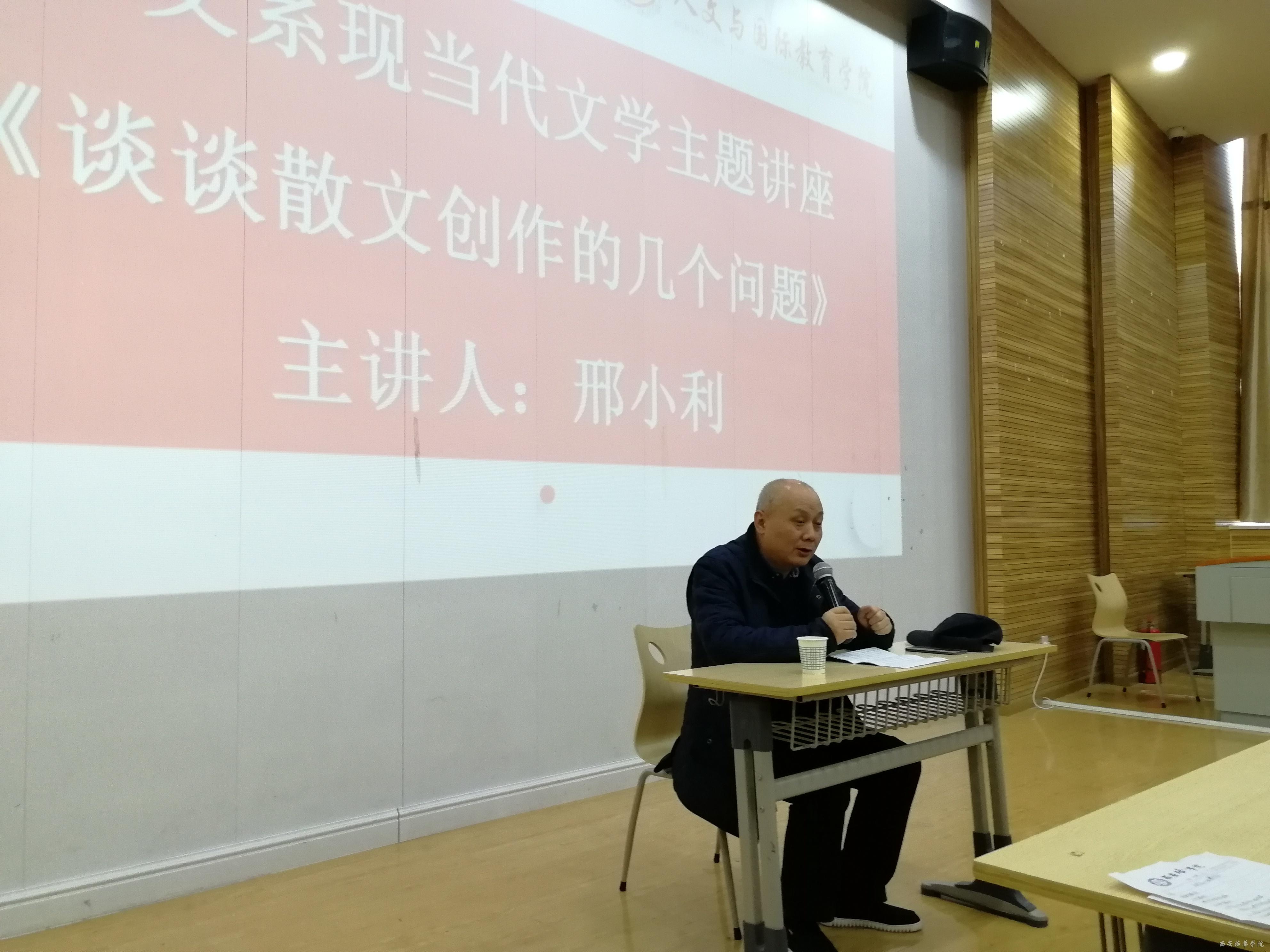2019年11月27日下午两点半,中文系在J101举办了《谈谈散文创作的几个问题》主题讲座,本次讲座由陕西白鹿书院常务副院长、中国书院学会副会长、陕西省柳青文学研究会会长、陕西省散文学会副会长邢小利主讲,中文系主任张静副教授,副主任罗妮、付丽伟老师与中文系全体教师及部分学生代表参加了此次讲座。