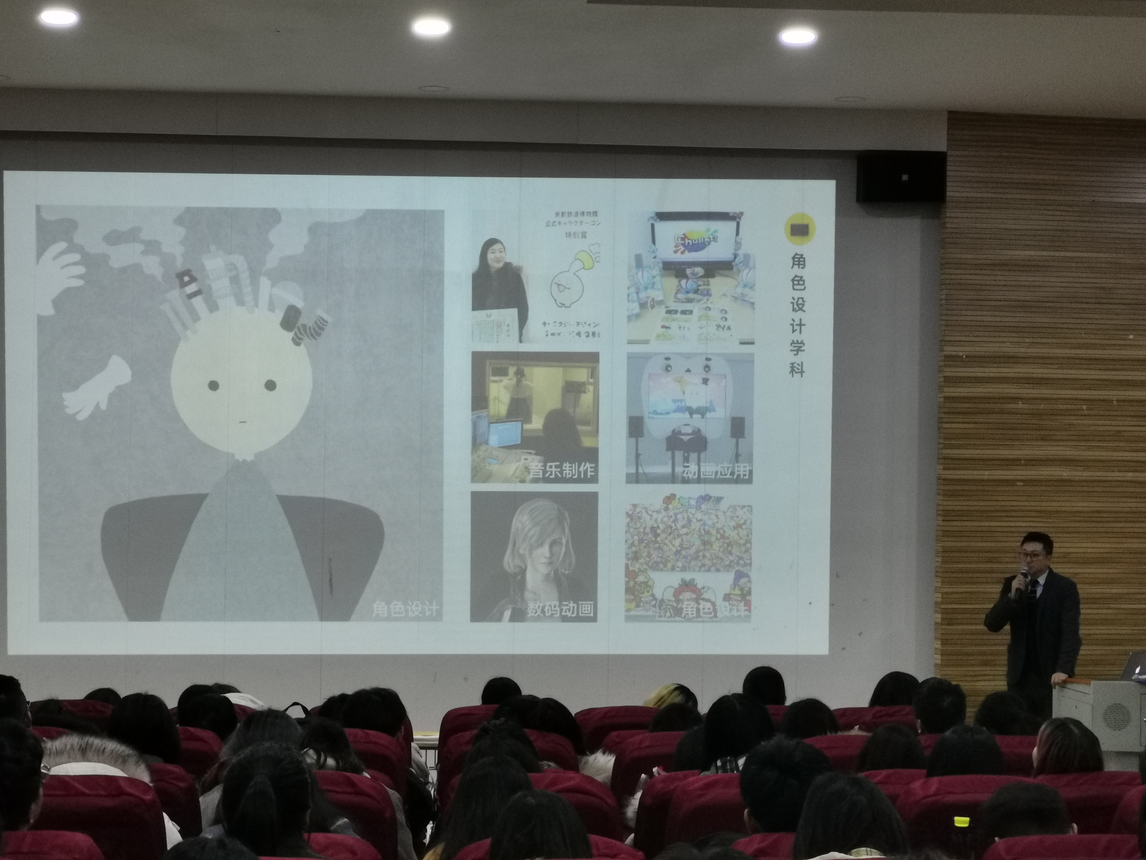 片刻休息之后,15点30分中日双方与会人员移步说明会场。在那里等候的日语专业的同学以热烈的掌声欢迎来自日本京都高等教育界的客人。说明会在刘建强教授的主持下正式开始。岩松义秀首先致辞,向我校领导和老师以及全场的同学们表示欢迎和感谢,随后,由国际事业部的丰田亮天先生,以PPT丰富的画面介绍了日本古都京都具有的历史文化以及与古长安的文化渊源和当今作为人文、学问之都的独特魅力。随后,京都产业大学、京都立命馆大学、京都造型艺术大学的代表依次登台,以具体丰富详实的内容和画面讲述了各自大学的办学历史、现状和特色,尤其是在留学生教育方面的成就。在场的同学们,对于能够带来临场感的多视角下的介绍内容,表现出了浓厚的兴趣,不时报以掌声予以回应。
