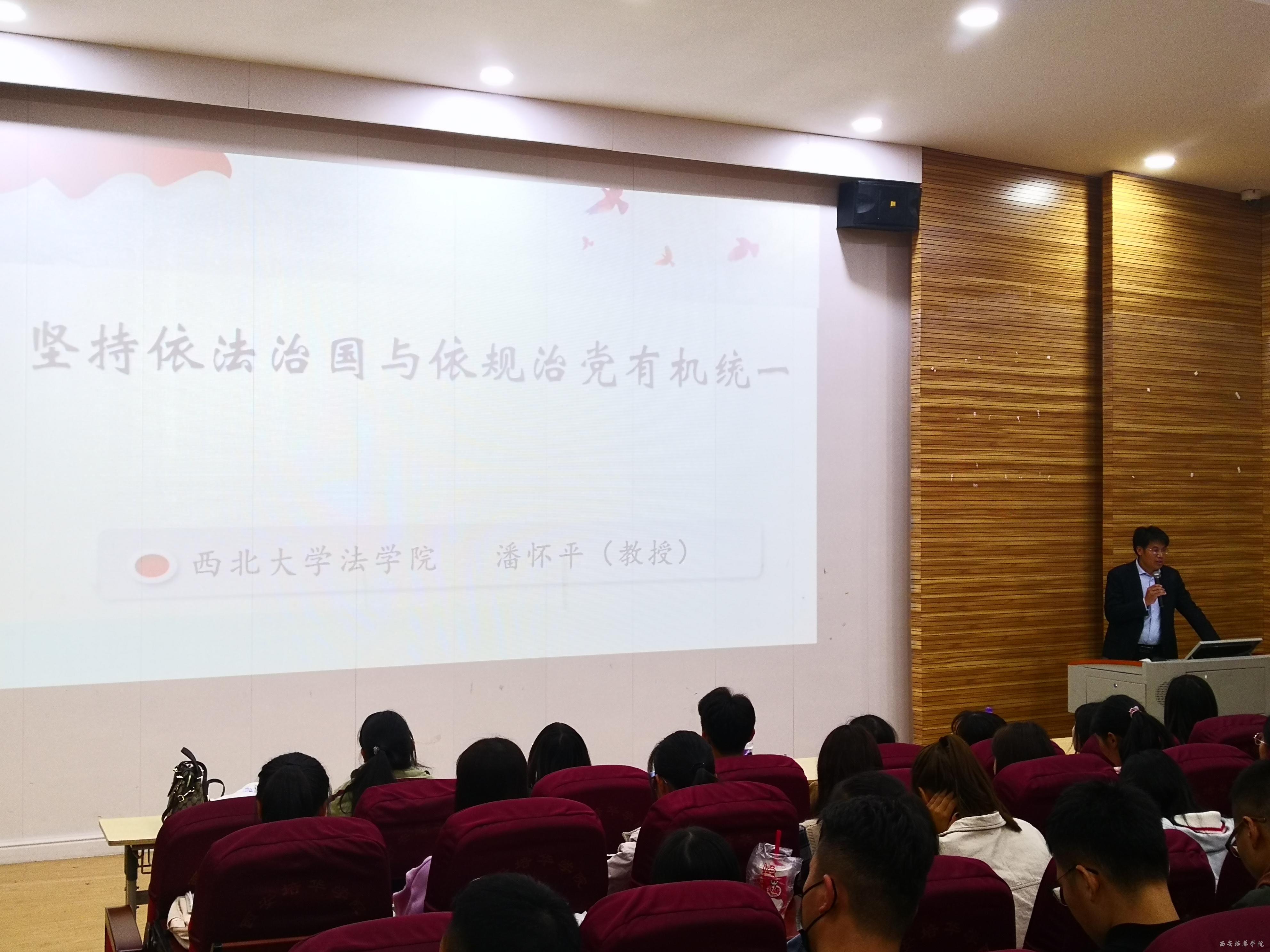 “百名法学家、百场报告会”系列讲座正在我校火热进行中,2019年10月29日下午西北大学法学院潘怀平教授为我们法学院的全体师生带来了一场《坚持依法治国与依规治党有机统一》的精彩报告。