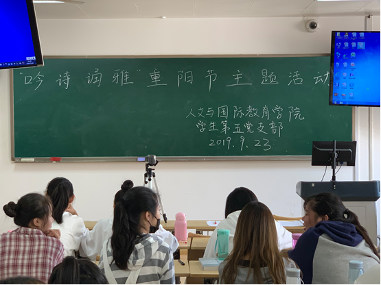 2019年9月23日,人文与国际教育学院学生第五党支部在1406教室开展“吟诗诵雅”重阳节主题活动。旨在不断锤炼党性,号召党员干部要带头继承发扬优良的传统文化,守住传统节日的文化精粹,防止一切腐朽思想侵蚀。