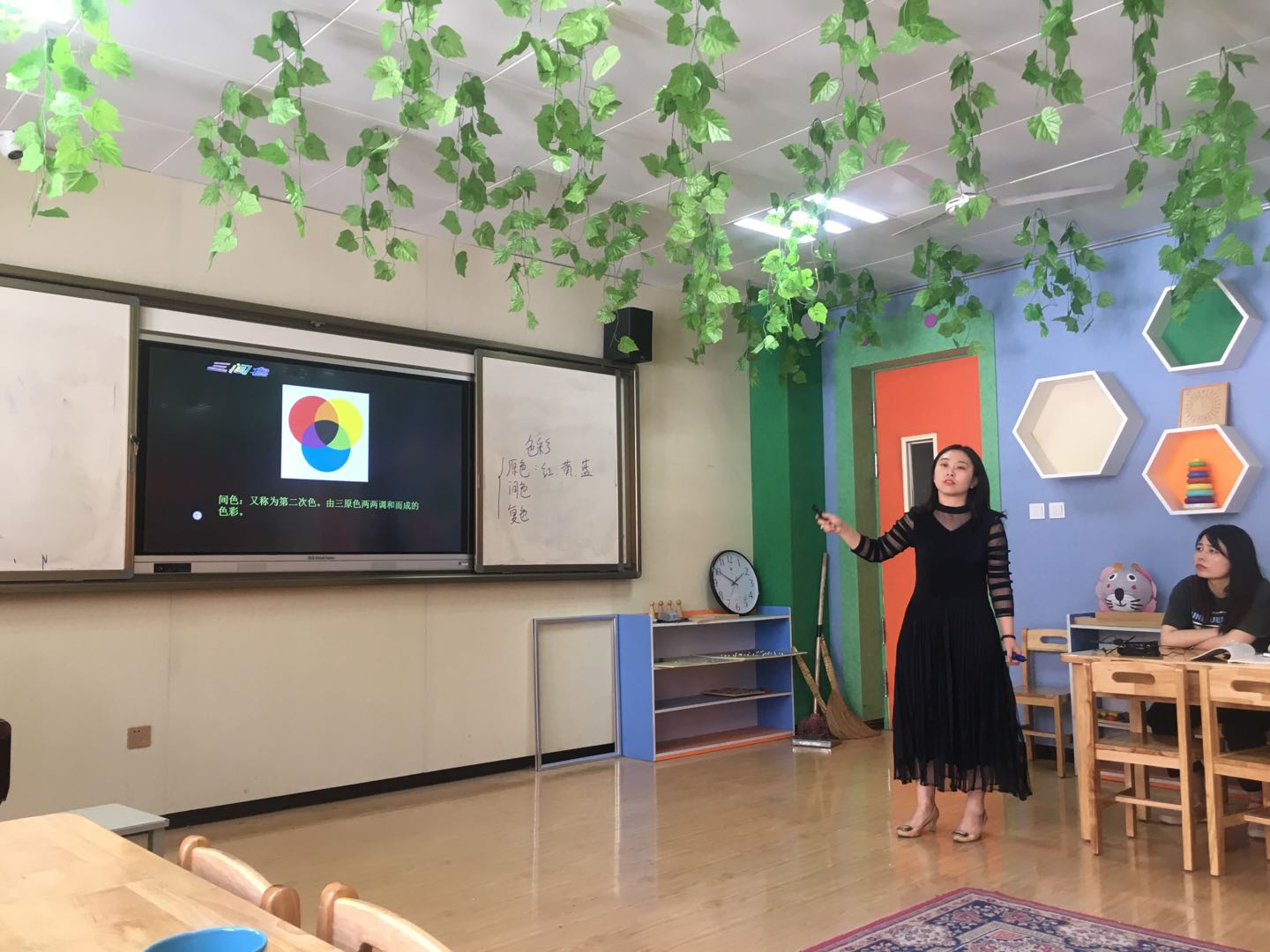 雷婧老师汇报课的内容是选自《美术》中的色彩基础知识。雷老师重点讲述了三原色和色彩的三要素。