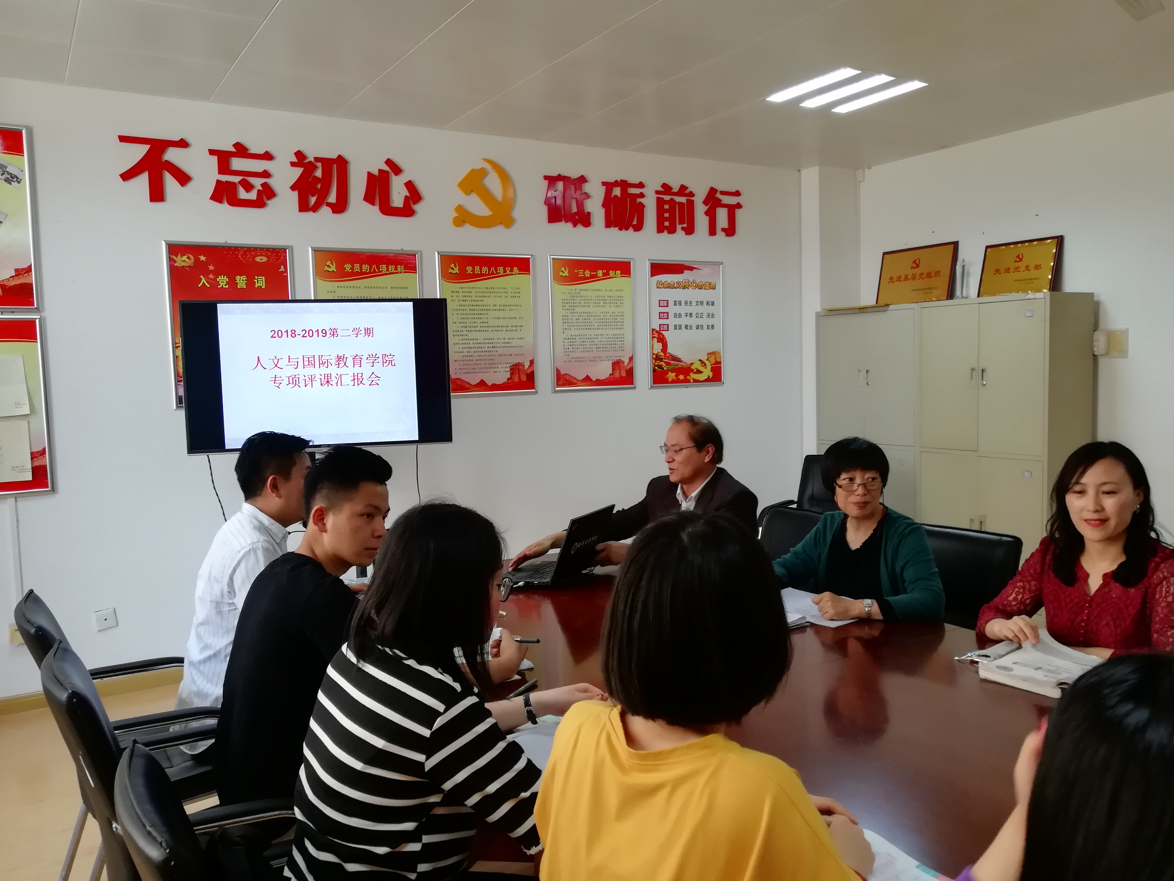 本学期以来,人文与国际教育学院进行了听评课专项活动。作为活动的一部分,2019年5月20日下午两点至四点,我院外语系举行了部分听评课教师阶段汇报会。参加汇报会的有人文与国际教育学院督导组组长甘世安教授、督导组成员王欣荣教授,部分日语专业、英语专业学生等,先后听取了屈江波、韩翠萍、刘云航三位老师的授课汇报。